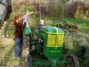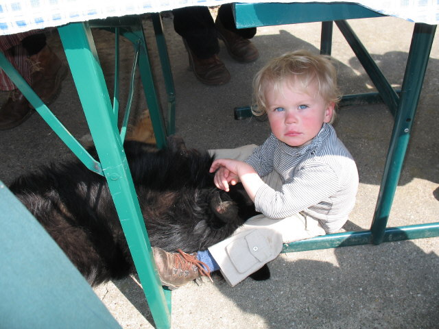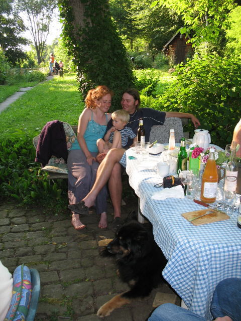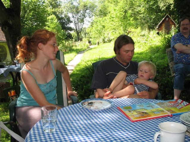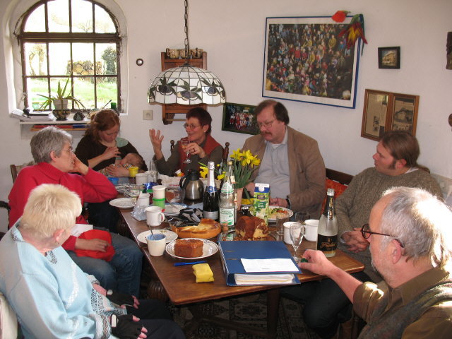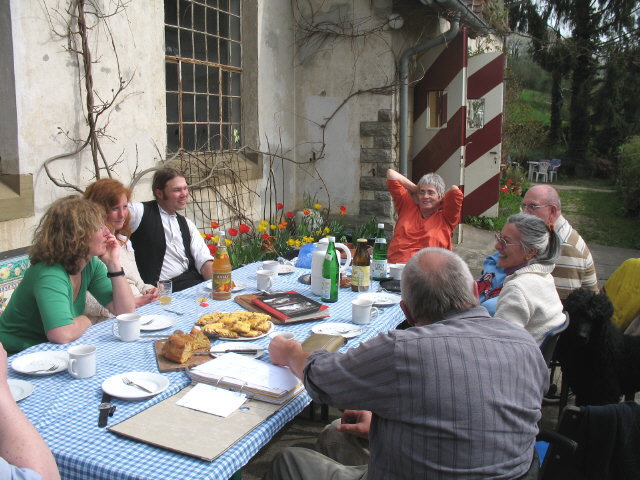 Schönes sonniges warmes Wetter (wer hätte dies noch vor einer Woche für möglich gehalten?). Filsinger's haben ihre Kühe gestern auf die Weide gegenüber getrieben. Marlin hat die Maisbachtaler fest im Griff. Nachdem Franz' s Jahresabrechnung begutachtet war (die Grube ist leer), wurden wir mit einem köstlichen Mahl von Céline und Björn beglückt: Gebackene Forelle aus Schlierbach, junges (jugendliches?) Gemüse, Kartoffeln nach Gärtnerinnen-Art, diverse Salate und knackige Frucht-Spieße. Dazu ein erlesener Riesling - kühl serviert. Danach Exkursion in den Garten: Pfirsiche blühen, die Schnecken fangen an zu knabbern, Björn hat mehrere Bäume gestutzt, damit Reinhold's Getreide besser wächst. Die Goldfische haben den furchtbar kalten Winter überlebt und präsentieren zahlreichen Nachwuchs, nun kindersicher eingezäunt. Die Pfirsiche blühen zartrosa, Lisas Felsenbirne weiß. Die Frösche quaken leider noch nicht - wohl noch etwas zu früh und nächtens zu kalt für die Liebe? Zum Kaffee gibt es feine Kuchen von Christa (Kuchen mit Schinken und Käse scharf/sauer sowie Gugelhupf süß) und eine delikate Apfeltorte von Celine). Dies alles unter blauem Himmel, bei sommerlichen Temperaturen vor dem nun bereits seit 29 Jahren im Frühling immer wieder blühenden Tulpebeet. An alle, die leider nicht da waren und wir sehr