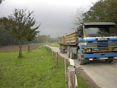 12.2.2002, die Lkw wieder mit Kalkstein beladen über die Steinbruch-Ostausfahrt