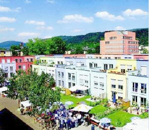 Südländisches Flair vermitteln die bunten Reihenhäuser im Inneren des EichendorffForums, dahinter erhebt sich der Büroturm Foto: Kresin Im Westen nichts Neues? Weit gefehlt, zumindest wenn es um die bauliche Gestalt und Betriebsamkeit des Rohrbacher Westens geht. Das Gelände des ehemaligen Nanz-Warenlagers neben den Campbell Barracks wurde durch die Fertigstellung zweier Bürogebäude und 58 Reihenhäuser nicht nur einer neuen Verwendung zugeführt. Mit dem allmählichen Einzug der Bewohner seit Dezember 2001 füllte sich das Gebiet des ersten fertig gestellten Bauabschnitts an der Fabrikstraße auch so richtig mit neuem Leben. Reges Treiben herrschte erst recht am Tag der Einweihung, zu dem neben Oberbürgermeisterin Beate Weber allerhand weitere Politprominenz und Vertreter der Baubeteiligten erschienen waren. Auch wenn die dicht aneinander grenzenden, geraden Wohnhausreihen des nach dem Romantiker Joseph Freiherr von Eichendorff benannten Forums auf das Auge des Festgastes nicht unbedingt romantisch wirkten: Die befragten Bewohner zeigten sich mit ihrer neuen Bleibe hoch zufrieden und lobten die ausgesprochen freundliche Atmosphäre im Forum. "Rohrbach hat einen schönen Farbklecks bekommen", freute sich Oberbürgermeisterin Beate Weber denn auch über die bunten Häuserblocks und zeigte sich froh, Familien in der Stadt bezahlbaren Wohnraum bieten zu können. Gemeint waren damit nicht etwa Geringverdienende, sondern "hervorragend ausgebildete junge Leute, auch aus anderen Ländern", wie die Oberbürgermeisterin die Zielgruppe beschrieb, die für den Kauf von ungefähr 150 Quadratmetern Wohnfläche etwa eine Viertel Million Euro berappen musste - relativ preisgünstig für Heidelberger Verhältnisse. Die Stadt brauche viele qualifizierte Arbeitskräfte und müsse Rahmenbedingungen für entsprechenden Wohnraum schaffen, erklärte die Oberbürgermeisterin. "Heute wohnen und lachen hier über hundert Kinder", begrüßte der Vertreter der Fregalla Weidenhammer GdbR, Ralf Weidenhammer, die Festgäste stolz. Die Büro- und Gewerbeflächen des kantig- hohen Eichendorff-Turms im Osten und des Westgebäudes sind nach seinen Worten ebenfalls schon zum großen Teil vermietet. Als Eröffnungssymbol übergab Weidenhammer der Familie Jentzsch ein Schaukeltier, das sich zur Rutsche und der Schaukel auf den Minispielplatz gesellen soll. Die stadtplanerische Konzeption, die seinerzeit die Ereignisse und Folgen des 11. September nicht hatte voraussehen können, war von einer Mitbenutzung der amerikanischen Spielplätze ausgegangen, die nun militärisch abgesperrt sind. "Mit dem 11. September haben wir leider den Riesenspielplatz bei den Amerikanern verloren", bedauerte Weidenhammer. Auf Nachfrage der Zeitung berichteten Eltern zwar, dass die Benutzung des einen Spielplatzes geduldet würde, so wohl fühlten sie sich dabei aber offenbar nicht. "Für die Kinder müssen wir noch etwas tun", thematisierte Oberbürgermeisterin Beate Weber das Problem in ihrer Eröffnungsrede. Auf Kritik an fehlenden öffentlichen Wegen wandte sie verheißungsvoll ein, es müsse auch nach der Eröffnung noch Aktivitäten geben und nährte damit die Hoffnungen der vielen jungen Familien des Eichendorff-Forums auf künftige städtische Aktivitäten. Jutta Wiech, RNZ vom 9.7.2002, www.rnz.de