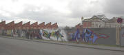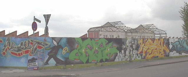 Graffitis bemalen 840 qm Bauzaunleinwand am "Quartier am Turm"Kunst braucht Raum. Nicht nur für den öffentlichen Diskurs, sondern auch Raum im ganz wörtlichen Sinne. Hierbei haben es nämlich gerade neue Kunstformen besonders schwer, ihren Platz im allgemeinen Bewusstsein zu finden. In dieser Position befindet sich wohl auch noch die Graffitikunst. Von vielen wird diese Erscheinung der jüngeren Künstlergeneration eher als "Schmierereien" verpönt denn als vollwertige Kunst verstanden. Verständlich dann, wenn die bunten Schriftzüge aus heimlichen Nachtaktionen des morgens frisch geweißte Wohnhäuser "zieren". Wo aber hin mit all der jungen Kreativität, wenn "legale" Flächen rar sind? Allein in Heidelberg gibt es etwa 100 aktive Sprayer - nicht schwer auszurechnen, wie hoch der Quadratmeterbedarf an Sprühflächen sein dürfte. Abhilfe schafft eine Aktion der Hochtief Projektentwicklung GmbH. Schon in Berlin und anderen Städten wurden Bauzäune zur Verfügung gestellt, um den "Writern", wie die Sprayer in der Szene genannt werden, legalen Raum für ihre Arbeiten zu schaffen. Nun standen auch in Heidelberg rund 840 Quadratmeter weißeste "Bauzaunleinwand" zur freien künstlerischen Gestaltung bereit. Und wirklich - es muss wohl ein enormes Defizit an solchen Flächen bestehen, denn etwa 70 junge Sprayer aus allen Teilen Deutschlands, aber natürlich auch Einheimische waren angereist, um mit der Sprühdose dem monotonen Weiß den Garaus zu machen. In Heidelberg-Rohrbach ist die Hochtief Projektentwicklung zusammen mit der Heidelberger Firma Epple & Kalkmann gerade dabei, auf dem Industriegelände der ehemaligen Waggonfabrik Fuchs ein Wohn- und Gewerbegebiet zu erstellen. Dort steht nun also ein Bauzaun, der derzeit für alle sichtbar mit Graffiti besprayt ist. Rüdiger Glatz ist Fachmann, was Graffitkunst angeht, und kennt viele der Sprüher, die jetzt in Rohrbach zur Stadtgestaltung beigetragen haben. Glatz, der bei einer Firma für Profisprühfarbe arbeitet, freut sich über die gute Idee, die ein Joint Venture darstellt: Hochtief profitiert imagemäßig durch "Jugendförderung", die "jungen Wilden" können oftmals schon lange im Kopf vorhandene Ideen in die Realität umsetzen. Eine Themenvorgabe gab es nicht. Trotzdem besteht eine gewisse Aufteilung der Wände. Zur Heinrich-Fuchs-Straße hin haben sich die Sprayer inhaltlich auf das Thema "Fernsehen/Medien" geeinigt. Parallel zur Heinrich-Fuchs-Straße durften die Heidelberger Youngsters sprühen. An einer anderen Ecke wiederum sprühten die Profis, die sonst für Auftragsarbeiten Honorare im vierstelligen Bereich erhalten. Der Regelfall ist es natürlich nicht, dass Graffitikunst kommerziell erfolgreich ist, und viele junge Künstler leben die moderne Version der Spitzweg-Idylle. Aber selbst "etablierte" Graffitisprayer ohne drängende Geldsorgen sind dankbar, wenn sie ihre eigenen Ideen der Öffentlichkeit präsentieren können. Zu sehen bekommt der umherschlendernde Passant zwar auch bildliche Graffiti, zum größten Teil aber haben die "Writer" sich mit ihrem persönlichen "Tag" vorerst verewigt. Ein "Tag" ist die individuelle Signatur eines Writers, an der man ihn erkennen kann. Meist sind es auch diese " Tags", die an den Häuserwänden prangen. Rüdiger Glatz dazu: "So genannte Schmierereien fabrizieren zumeist sehr junge Sprayer, die sich unbedingt ausprobieren wollen. Stehen dann keine "legalen" Flächen zur Verfügung, muss leider oftmals die Hauswand herhalten." Bei dieser Aktion aber durfte ganz erlaubt gesprüht werden. Für die Ewigkeit sind die bunten Schriftzüge aber nie bestimmt. Schließlich muss immer damit gerechnet werden, dass Pinsel und Farbrolle den ursprünglichen Zustand wiederherstellen. Auch der Bauzaun wird mitsamt den Graffities geräumt werden, wenn hinter ihm neue Wohneinheiten entstanden sind. Um die ganze Angelegenheit an der Heinrich-Fuchs-Straße mit einem karitativen Beigeschmack zu würzen, hat sich die Hochtief Projektentwicklung nun überlegt, die schönsten Graffiti-Motive auszuwählen und in minimiertem Format als Postkarten herauszubringen. Diese Postkarten sollen dann für voraussichtlich 2,50 Euro bei Immobilienmessen zu Gunsten der Flutkatastrophenopfer verkauft werden. Eva Britsch, RNZ vom 5.9.2002, www.rnz.de